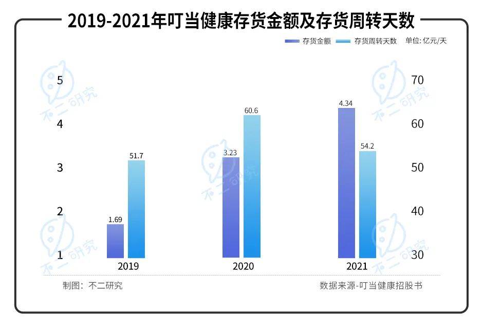 2019-2021年,叮當健康的存貨金額分別為1.69億元、3.23億元和4.34億元,據此前招股書顯示,2018年的存貨金額為0.63億元,同比增速分別為168.72%、91.91%和34.18%。存貨周轉天數分別為51.7天、60.6天和54.2天。