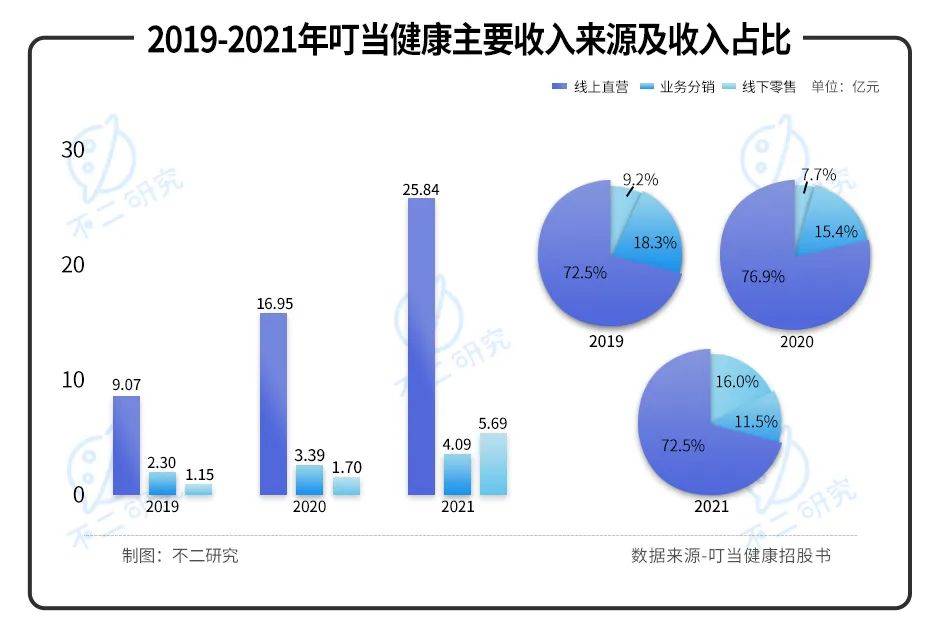 據招股書顯示,2019-2021年,叮當健康收入71.83億元,凈虧損27.93億元。三年間,來自藥品及醫療健康業務的收入均達95%以上,線上直營收入超70%。