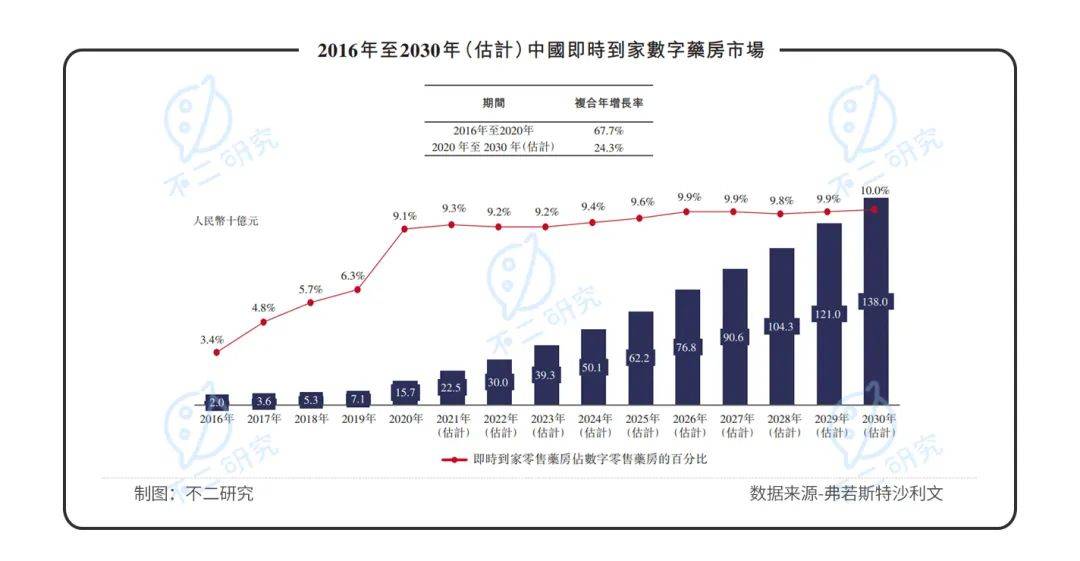 據弗若斯特沙利文報告,2016年至2020年,即時到家數字藥房市場以67.7%的復合年增長率自2016年的20億元開始大幅增長,預計2030年將達到1380億元,復合年增長率為24.3%。此外,預計數字零售藥房市場上的即時到家數字藥房的占比將從2020年的9.15%增加至2030年 的10.0%。