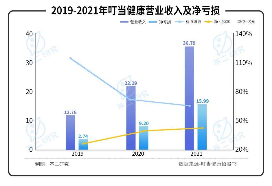 據招股書顯示,2019-2021年,叮當健康的收入分別為12.76億元、22.29億元和36.79億元,據此前招股書顯示,2018年的收入為5.85億元,可以得出其同期營收同比增速分別為118.2%、74.7%和65.1%。