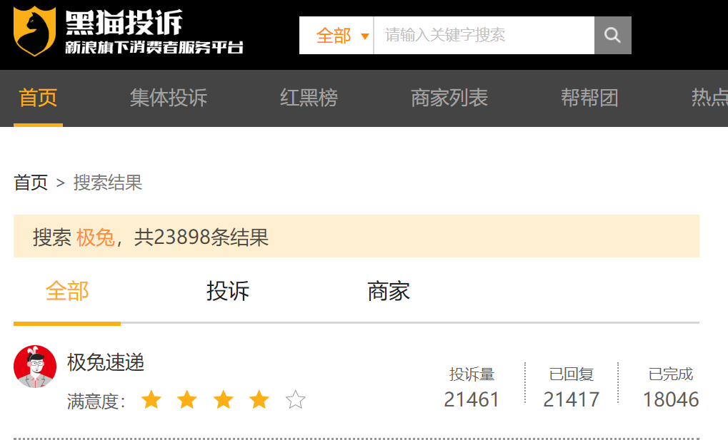 反觀極兔,除了小紅書上大量的用戶吐槽,黑貓投訴上的投訴量更是高達21461條。內容包括“丟件”“推卸責任”“快遞破損”等等。某些電商平臺評論區,甚至出現“發極兔直接退”“發極兔就差評”的“激進”購物者。