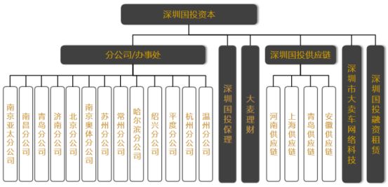 另外,深圳國投資本管理有限公司組織架構顯示,公司旗下業務包括13家分公司、4家供應鏈公司,以及國投保理、國投融租、大賣車網和大麥理財。