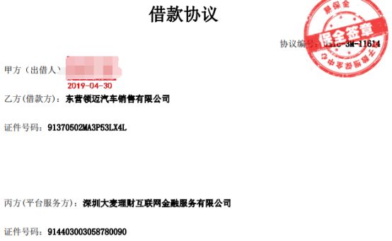 探長在大麥理財投資的第一個標的編號為“麥田3月計劃-3M19042801”,根據出借合同顯示,項目金額100萬元,還款方式為到期一次性還本付息,借款用途為支付信息服務費等經營性周轉,借款企業為東營領邁汽車銷售有限公司,保障方式為第三方擔保。值得注意的是,出借合同中并未出現第三方擔保機構名稱。