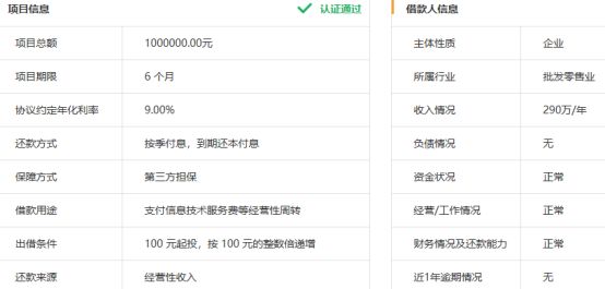 此外,大麥理財信披極為簡單。以項目編號為“麥田6月計劃-6M19051601”為例,平臺只披露借款總額100萬元,項目期限6個月,約定年化利率9%,借款企業還款來源為經營收入,收入情況為290萬/年,擔保方式為第三方擔保。