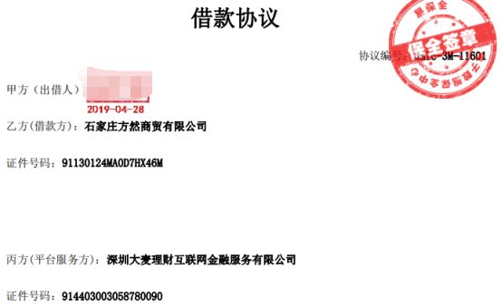 探長在大麥理財投資的第二個標的編號為“麥田3月計劃-3M19042301”,出借協議顯示,借款企業為石家莊方然商貿有限公司,工商資料顯示,該公司成立由于2019年1月31日,注冊資本500萬人民幣,法人代表及唯一股東為冀方芡。