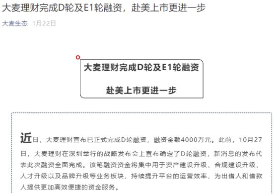 1月22日,大麥理財在其官方微信公號發布消息稱,平臺完成D輪及E1輪融資,赴美上市更進一步。探長注意到,無論是D輪融資還是E1輪融資,大麥理財既沒有投資方,也沒有披露融資金額。