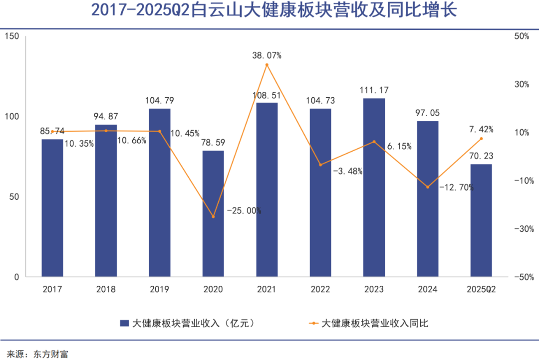 根據王老吉母公司白云山的歷年財報,以王老吉為主體的大健康板塊自從2019年之后,也陷入了營收動蕩。除去特殊年份的不利影響,去年大健康板塊營收97.05億元,在正常財年內也出現了首次下滑。
