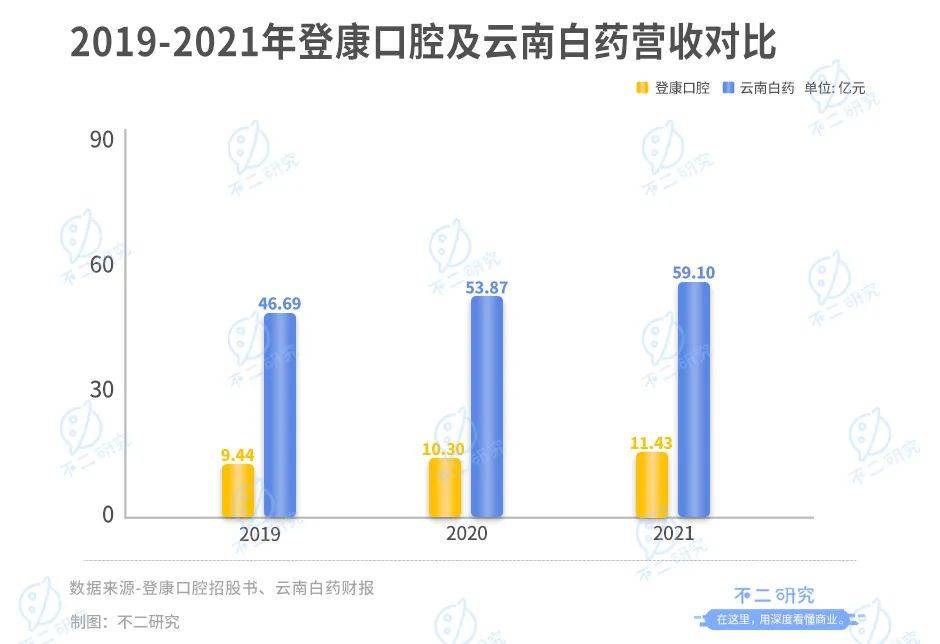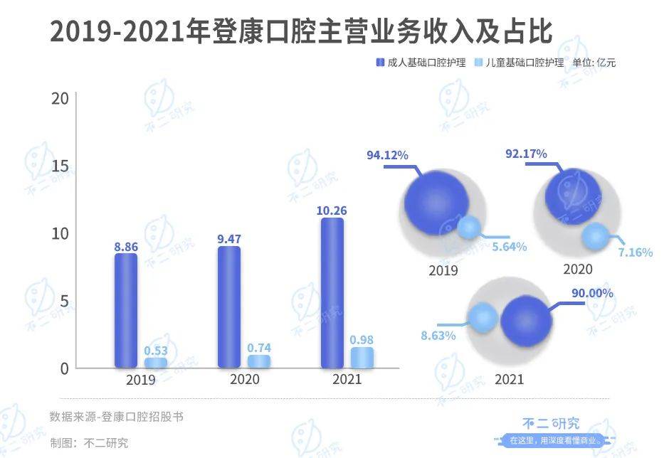 「不二研究」發現,登康口腔的營收正處于平穩增長中。招股書顯示,2019年-2021年,登康口腔營業收入分別為9.44億、10.30億和11.43億元,其中2020年和2021年增速分別為9.08%、10.97%。
