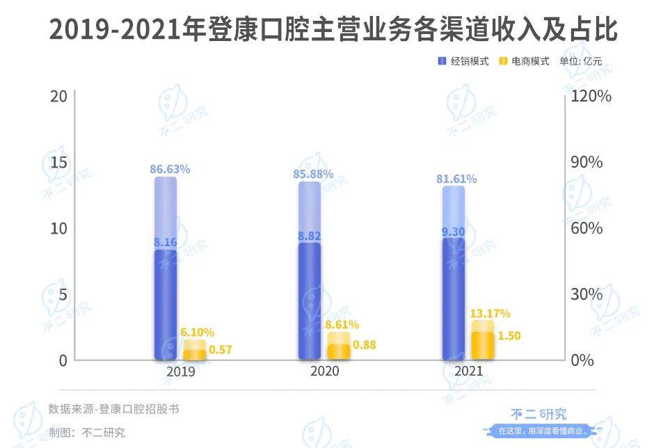 據招股書,2019年-2021年,登康口腔經銷模式收入分別為8.16億、8.82億和9.30億元,占比分別為86.63%、85.88%及81.61%。電商模式雖在發展,但2021年電商的收入占比只有13.17%。
