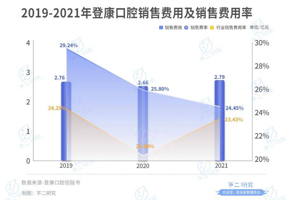 「不二研究」認為,營銷開支過高成為拖累凈利率的主要因素。招股書顯示,2019年-2021 年,登康口腔的銷售費用分別為2.76億、2.66億和2.79億元,銷售費用率分別達到29.24%、25.80%和24.45%。同期,行業銷售費用率平均值分別為24.25%、20.40%和23.43%;中位數分別為14.32%、15.13%和12.24%,均低于登康口腔。