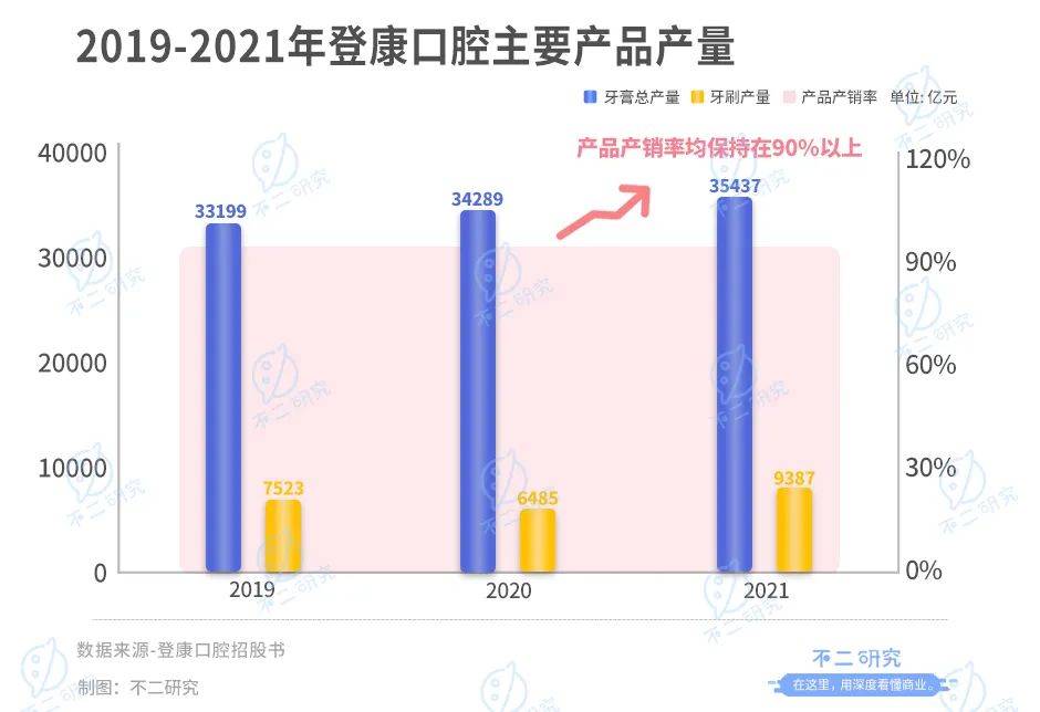 招股書顯示,2019年-2021年,登康口腔牙膏總產量分別為33199噸、34289.22噸和35437.16噸;牙刷產量為7523.38萬支、6485.34萬支和9386.97萬支,產品產銷率均保持在90%以上。