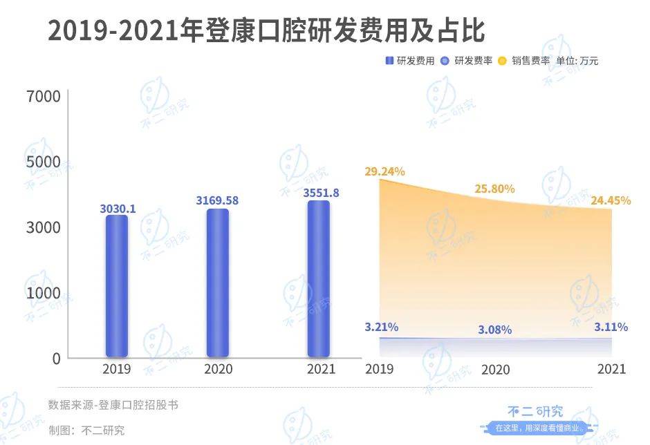 盡管在冷酸靈八十周年慶典上,董事長鄧嶸表示將持續發力“研發+推廣”,但事實上登康口腔在研發上的投入并不算多。招股書顯示,2019年-2021年,登康口腔的研發費用分別為3030.1萬元、3169.58萬元和3551.8萬元,對應的研發費用率為3.21%、3.08%和3.11%,與銷售費用率對比鮮明。