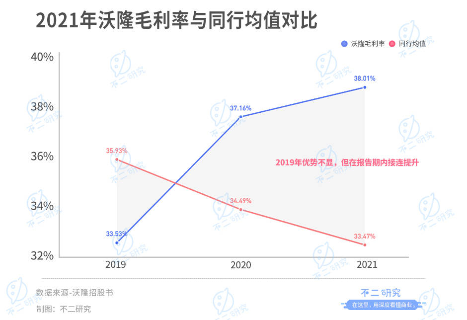 但在毛利率方面,沃隆卻領先大多數巨頭。招股書顯示,2019年-2021年,沃隆綜合毛利率分別為33.53%、37.16%和38.01%;可比公司毛利率平均水平分別為35.93%、34.49%和33.47%。沃隆的毛利率雖在2019年優勢不顯,但在報告期內接連提升。