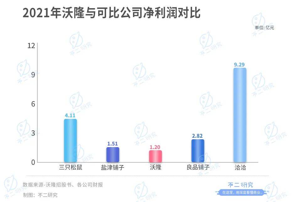 「不二研究」發現,沃隆的凈利潤也同樣未擺脫疫情影響。招股書顯示,2019-2021年,沃隆凈利潤分別為1.31億、0.89億和1.20億元,在2020年同樣經歷了高達32.06%的回落。從規模上來看,也難望巨頭項背。年報顯示,2021年三只松鼠、良品鋪子、洽洽和鹽津鋪子的凈利潤分別為4.11億、2.82億、9.29億和1.51億元,均高于沃隆。