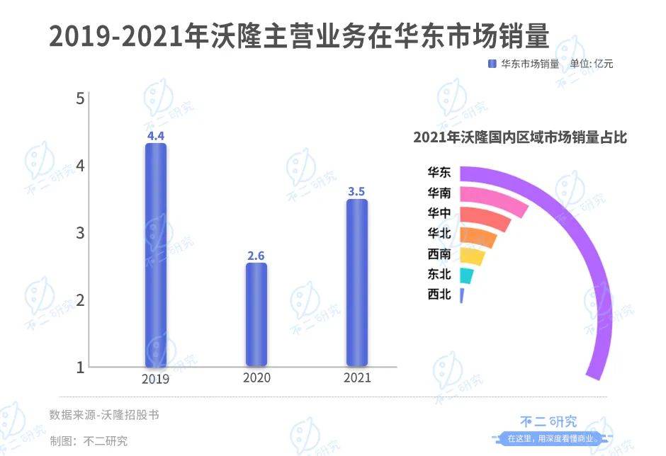 從區域銷售業績來看,沃隆還存在線下銷售區域過分集中的風險。招股書顯示,沃隆主營業務在華東市場的銷量為3.5億元,占整體營收的31.72%。華南、華北、華中、西南、東北、西北等六個國內區域市場銷量均不到億元,并且呈現全線銷量下滑的態勢。