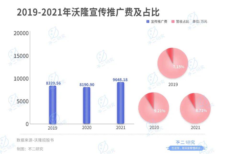 與眾多休閑食品企業一樣,沃隆在宣傳上不吝投入,通過打造品牌IP、明星合作、影視劇植入、頭部KOL帶貨等方式,提高品牌傳播聲量。招股書顯示,2019年-2021年,沃隆宣傳推廣費分別為8329.56萬元、8190.90萬元和9648.18萬元;占總營業收入的比重分別為7.15%、9.21%和8.71%。但高額的宣傳推廣費對沃隆業績的助力似乎有限,2021年的營收規模仍未回到疫前水平。
