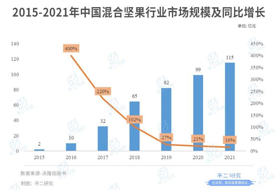 前瞻產業研究院數據顯示,2015年~2021年,我國混合堅果行業市場規模從2億元增長到115億元,總體規模雖增長數十倍,但增長率從400%劇降至16%;2021年沃隆的混合堅果同比增長率只有10.2%,不及行業增速。