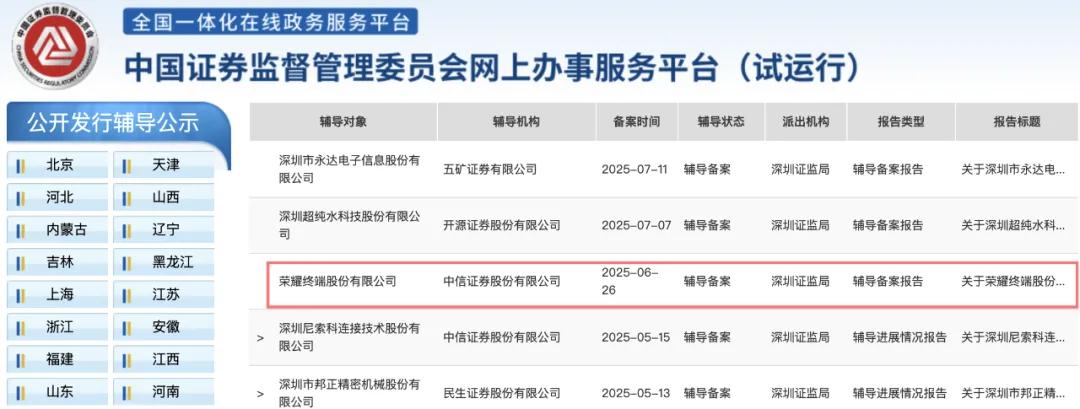根據證監會官網的內容,今年下半年榮耀終端股份有限公司(榮耀)已在深圳證監局進行上市輔導備案,中信證券擔任輔導機構。