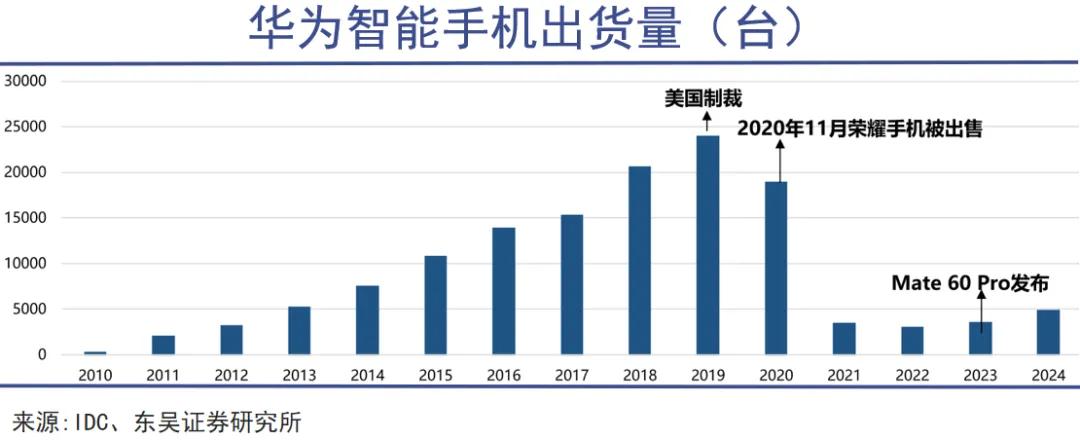 2020年,華為遭受美國多輪制裁,直接封死了華為從第三國購買帶有美國技術產品的渠道,尤其是無法獲得臺積電代工,強行阻斷了華為5G芯片的研發進程。受此影響,當年華為手機的出貨量遭遇斷崖式下跌,從2019年巔峰期的2.4億部驟降至2022年的不到3000萬部。