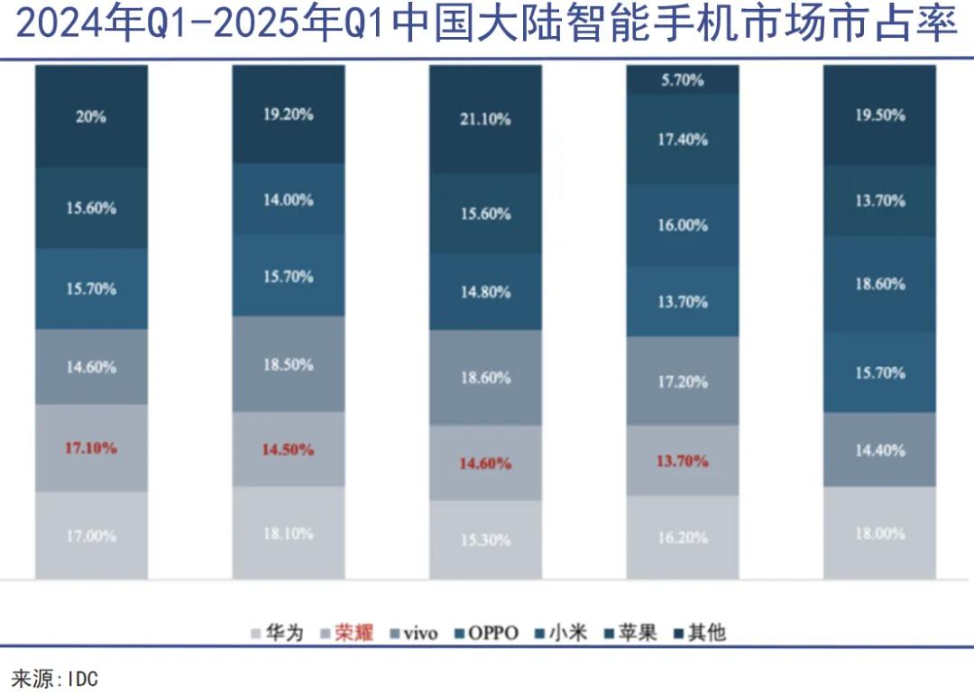 華為消費者業務全面復蘇。據IDC數據,華為手機市場份額從2023年第四季度的13.7%攀升至去年四季度的16.2%,而同期榮耀則從16.8%萎縮至13.7%。到今年一季度,榮耀進一步跌出了前五名的序列。