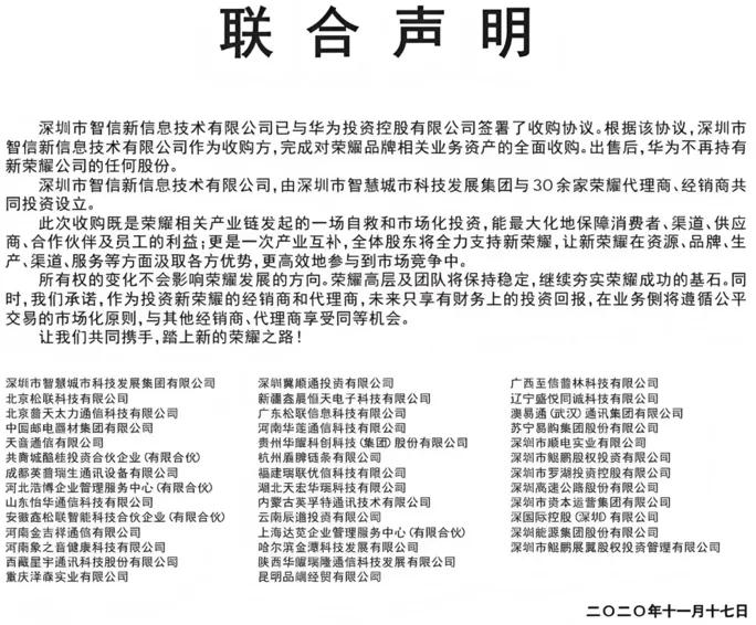 華為被迫“斷臂求生”,以2600億元(財新報道)的估值將榮耀剝離,接手方為深圳市智信新信息技術有限公司,后者由深圳智慧城市發展集團和30多家代理商、經銷商共同成立,其中不乏天音通信、蘇寧易購等全國連鎖商,以及北京松聯、山東怡華等區域連鎖店。