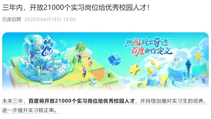 這只是其更大版圖的一部分。未來三年,百度將開放21000個實習崗位給優秀校園人才,并持續加強對實習生的培養與轉正機制。