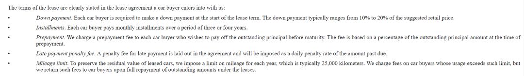 里程限制:為了保持租賃汽車的剩余價值,趣店對每年的里程數施加限制,通常為25,000公里。趣店會對使用超過此限制的購車者收取費用,但買家還款完畢后趣店會退還這筆費用。