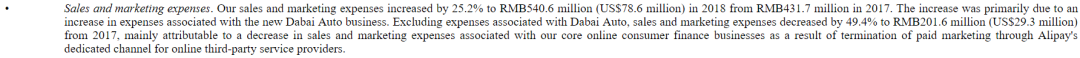 在其所有業務的銷售及營銷開支(sales and marketing)方面,由2017年的人民幣4.32億增加25.2%至2018年的5.4億。
