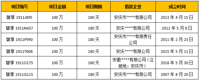 無(wú)獨(dú)有偶,探長(zhǎng)讀財(cái)發(fā)現(xiàn),碧有貸首頁(yè)展示的18個(gè)借款項(xiàng)目中,6個(gè)借款企業(yè)來(lái)自安徽省安慶市,且借款金額均為100萬(wàn)元,項(xiàng)目期限180天,成立時(shí)間最早的2007年8月份,最晚的2018年5月份。
