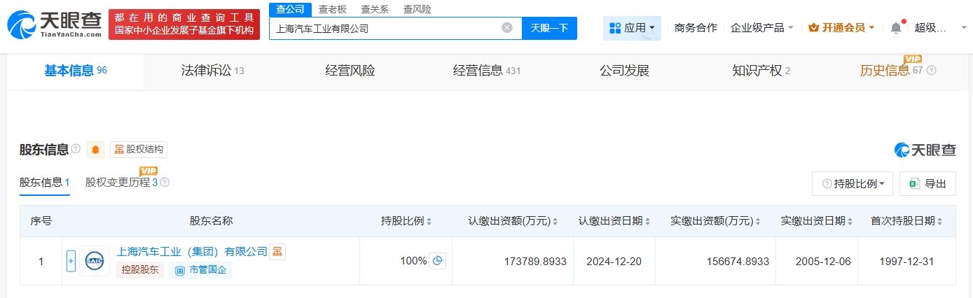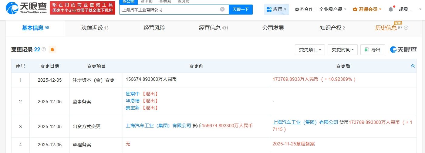 天眼查App顯示,近日,上海汽車(chē)工業(yè)有限公司發(fā)生工商變更,注冊(cè)資本由約15.67億人民幣增至約17.38億人民幣,增幅約10.9%。