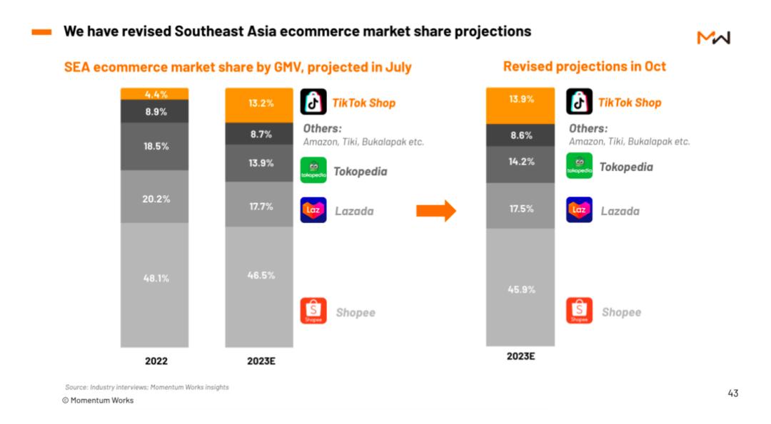 僅一年時間,在印尼電商市場的份額就增長到5%。第二年,TikTok Shop在東南亞市場的GMV猛增超過400%,達到44億美元。隨著全托管模式的上線,根據報道,TikTok Shop將2023年的GMV目標提升到了120億美元,在印尼電商市場的份額也將隨之躍升到13.2%。目前,TikTok在東南亞有3.25億月活,印尼占1.25億,貢獻了上半年東南亞整體GMV的44%。