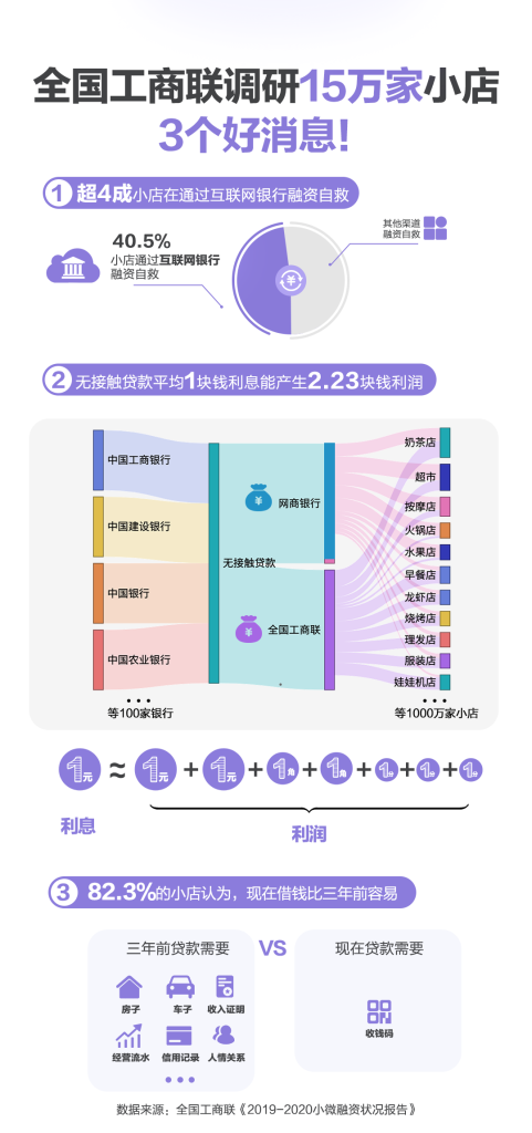 疫后小微企業(yè)及個體戶的資金需求突出,但絕大部分扶一把就能活;40.5%有資金需求的長尾小微經營者在通過互聯(lián)網(wǎng)銀行融資自救;70%獲得貸款的小微經營者認為精準“滴灌”的無接觸貸款有實效,平均1塊錢的利息能產生約2塊錢利潤。
