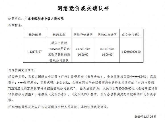 據(jù)天眼查信息顯示,今年1月,哈爾濱譽衡集團有限公司退出京東數(shù)科股東名單,其持有的對應出資額7423.33萬元的京東數(shù)科股被公開拍賣,起拍價14.8億,僅有1次出價記錄,國新央企競拍成功。按此估算,京東數(shù)科估值約為608億元。