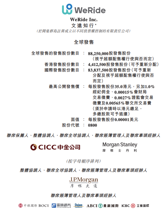 文遠知行宣布在香港聯合交易所進行全球發售,計劃發行共計88,250,000股A類普通股,其中香港公開發售占4,412,500股(5%),國際發售占83,837,500股(95%)。每股最高發售價為35.0港元,股票代碼為0800。