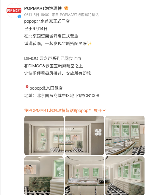 泡泡瑪特官方微博賬號發文宣布,POPOP北京首家正式門店已于6月14日在北京國貿商城開啟正式營業。此外,DIMOO 云之聲系列已同步上市。據悉,店內飾品覆蓋Hirono、MOLLY、SKULL PANDA、Crybaby、LABUBU、星星人等多個熱門IP,價格區間在319-2699元。