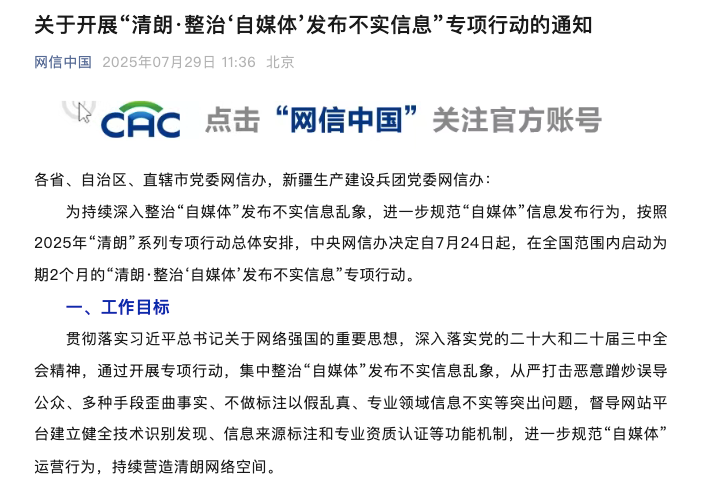 通知表示,為持續深入整治“自媒體”發布不實信息亂象,進一步規范“自媒體”信息發布行為,按照2025年“清朗”系列專項行動總體安排,中央網信辦決定自7月24日起,在全國范圍內啟動為期2個月的“清朗·整治‘自媒體’發布不實信息”專項行動。