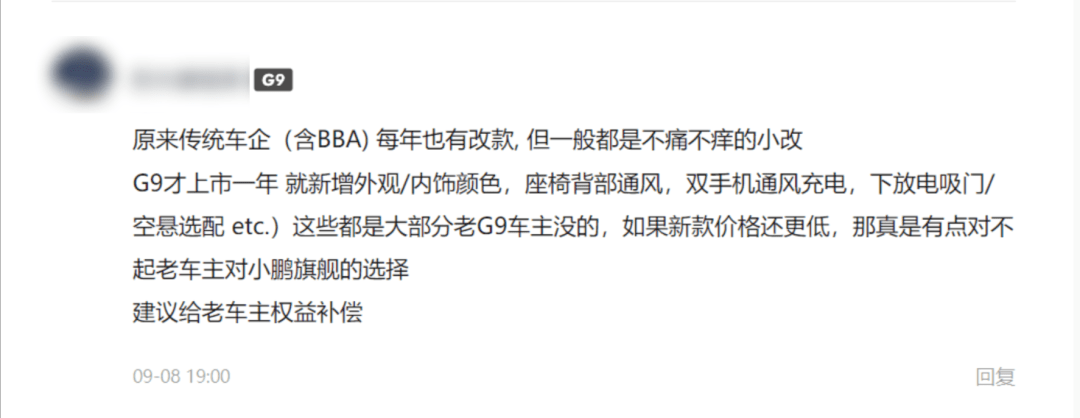 在小鵬官網(wǎng)的論壇版塊上,評(píng)論區(qū)早就能發(fā)現(xiàn)很多帶認(rèn)證的 G9 老車(chē)主在呼吁補(bǔ)償了。