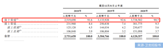 2018~2020年,衛龍線下渠道收入分別為25.2億元、31.3億元、37.4億元,營收占比高達91.6%、92.6%及90.7%。