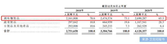 目前,辣條(調味面制品)仍然是衛龍最主要的營收來源,但占比正逐步縮減:2018~2020年,衛龍辣條的收入分別為21.62億、24.75億和26.90億元,占收入比重分別為78.6%、73.1%、65.3%。