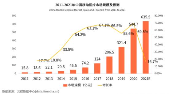 根據iiMedia Research(艾媒咨詢)數據顯示,截至2020年末,我國互聯網醫療用戶達到約6.61億人,移動醫療市場規模約544.7億元。2015-2020年移動醫療市場規模平均年化增長率超50%。