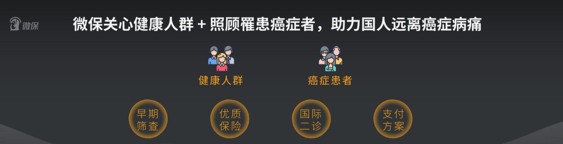 針對中國癌癥發病率高、誤診率高、死亡率高、患者治療負擔重的"四大痛點",微保聯合美年大健康、沃迪康、泰康在線、鎂信健康等合作伙伴,發布了業內首個 "抗癌全流程解決方案"。這是業內第一次全面覆蓋健康與癌癥患者人群,從醫療、保障、治療、支付四個環節提供全方位的保障方案。具體內容包括抗癌早篩服務、治療和特藥的保險保障、癌癥患者的國際二診服務,以及癌癥患者特藥購買的金融支付解決方案。