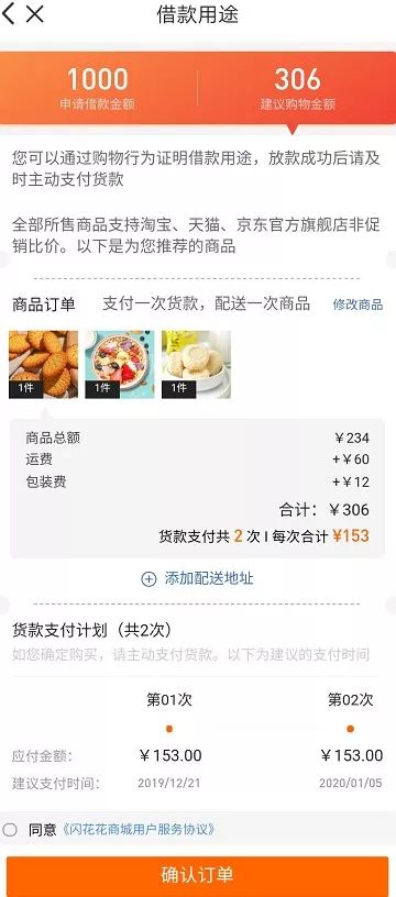 在用戶申請借款時,閃花花商城會直接推薦幾款產(chǎn)品,用戶直接確認訂單即可借款。同時用戶也可以進行修改選擇的商品,但僅有10款供用戶進行選擇,包括日用品和零食。
