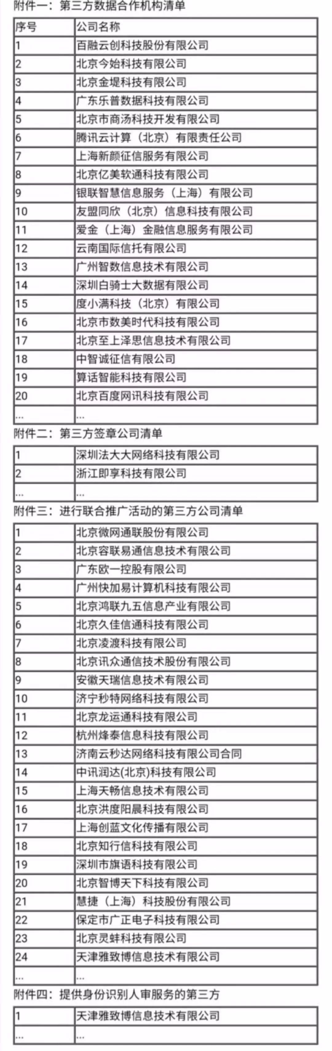 第三方數(shù)據(jù)公司:百融云創(chuàng)科技股份有限公司、北京今始科技有限公司、北京金堤科技有限公司、廣東樂普數(shù)據(jù)科技有限公司、北京市商湯科技開發(fā)有限公司、騰訊云計算(北京)有限責任公司、上海新顏征信服務有限公司、北京億美軟通科技有限公司、銀聯(lián)智慧信息服務(上海)有限公司、友盟同欣(北京)信息科技有限公司、愛金(上海)金融信息服務有限公司、云南國際信托有限公司、廣州智數(shù)信息技術(shù)有限公司、深圳白騎士大數(shù)據(jù)有限公司、度小滿科技(北京)有限公司、北京市數(shù)美時代科技有限公司、北京至上澤思信息技術(shù)有限公司、中智誠征信有限公司、算話智能科技有限公司有限公司、北京百度網(wǎng)訊科技有限公司。