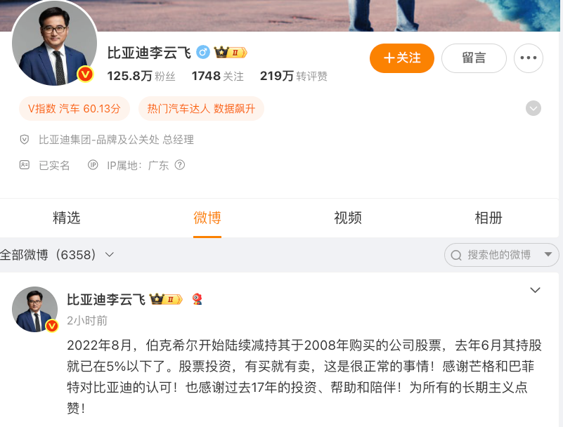 比亞迪集團-品牌及公關處總經理李云飛表示,2022年8月,伯克希爾開始陸續減持其于2008年購買的公司股票,去年6月其持股就已在5%以下了。