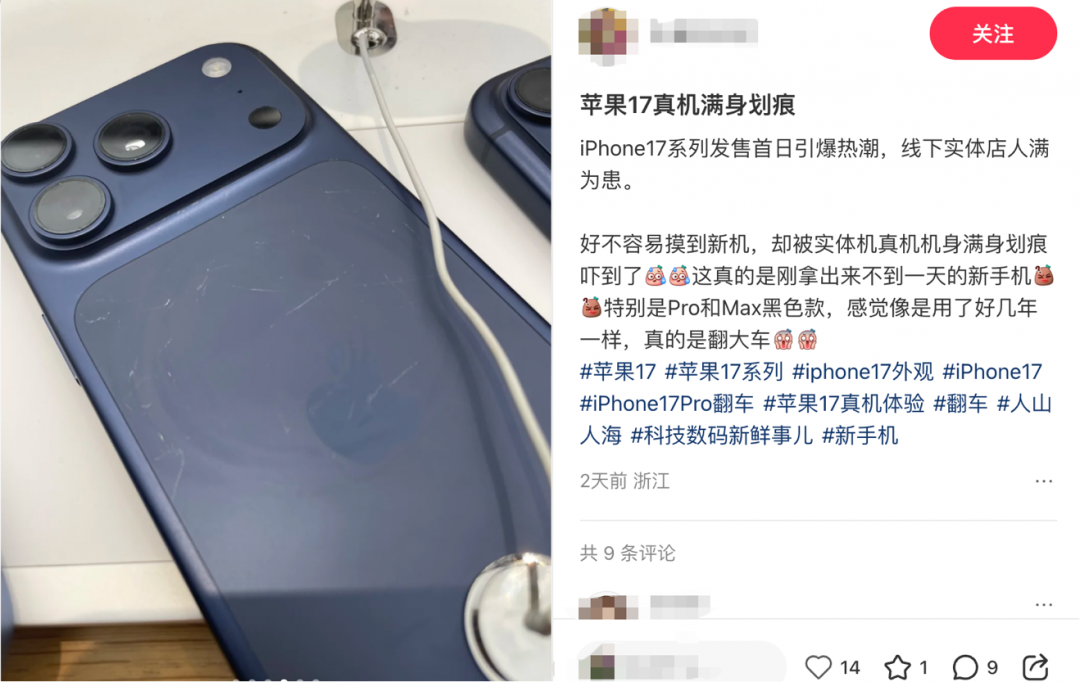 蘋果iPhone 17系列正式開售,引發了廣大消費者的關注和搶購熱潮。然而,隨著首批用戶陸續拿到新機,關于iPhone 17“邊框材質倒退”、“易刮花”等吐槽也隨之而來,引發熱議。今日早間,“iPhone 17首批用戶吐槽不斷”相關話題登上微博熱搜,截至發稿,相關話題閱讀量超過4537萬。