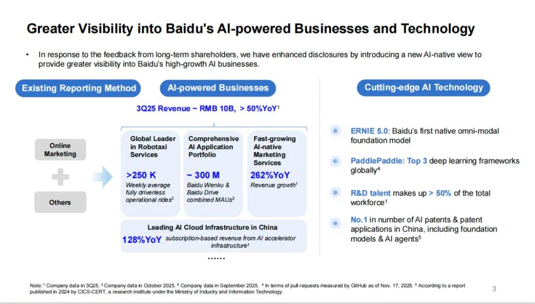 繼阿里之后,11月18日晚的百度2025年第三季度財(cái)報(bào)會(huì)上,該公司CFO何海建表示,自2023年3月發(fā)布文心一言以來,百度在AI領(lǐng)域的投入已超過1000億元人民幣。