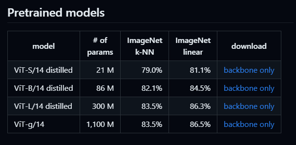 而且,從官方提供的四個預訓練模型來看,這四個面模型,參數最高的一個, ImageNet Linear 精度最大達到了 86.5% 。