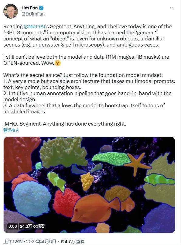 英偉達的人工智能科學家 Jim Fan , 甚至還把 SAM 的出現比喻成 CV 界的 “GPT-3 時刻 ” ,可見各位業內人士對 SAM 的認可了。