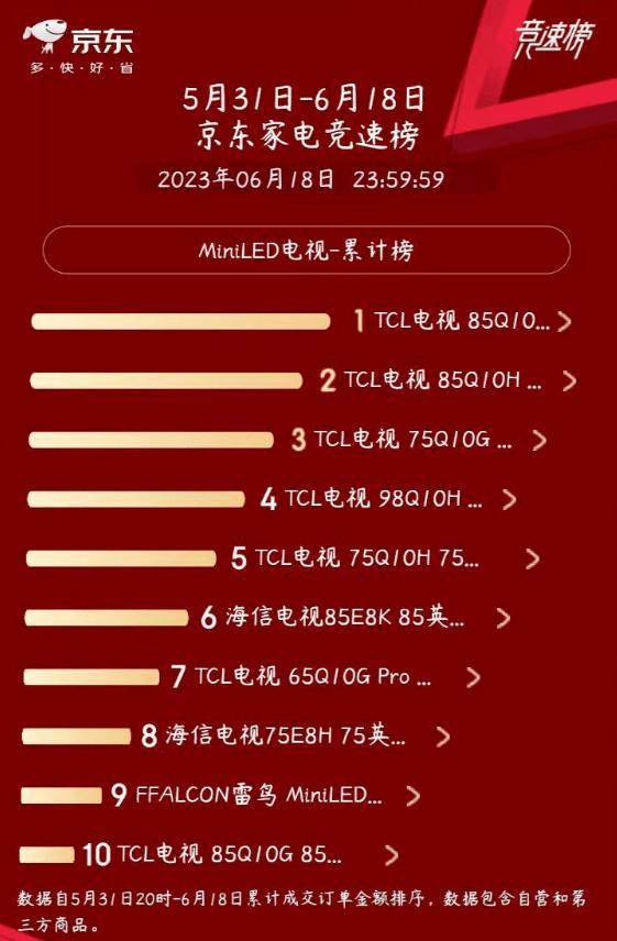 從“讓Mini?LED不再小眾”的Q10G到越級體驗的Q10H、X11G以及Q10G Pro,以及更高端的QD-Mini LED電視C12G系列、Q10H系列等,TCL科技的電視產品線已經基本涵蓋了中端、中高端和高端。在今年618京東的Mini LED電視榜單中,TCL科技電視直接霸占榜單,前十就占了八個。