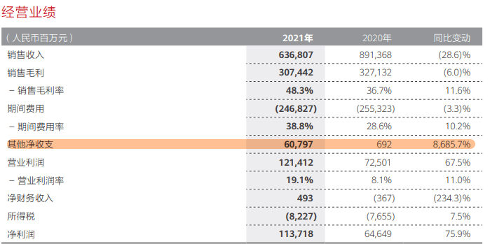 但稍微深挖一下就能發(fā)現(xiàn),利潤(rùn)里變化最大的,是其他凈收支這一項(xiàng),華為直接增長(zhǎng)率 8000% 。